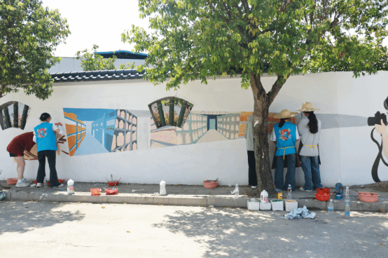 活动中,大学生们发挥专业优势,多维度助力乡村建设。在“乡村振兴”主题墙绘创作中,大学生们顶着酷暑,将本地特色农业与乡村文化巧妙融合,在墙面上勾勒出 “产业兴旺、生态宜居” 的美好图景。生动的画作不仅美化了村容村貌,更让乡村特色跃然墙上,成为乡村振兴的鲜活缩影。