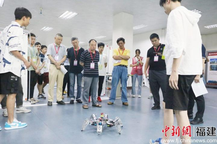 参赛选手展示“六足仿生救援机器人”作品野外救援功能。李娇榕 摄