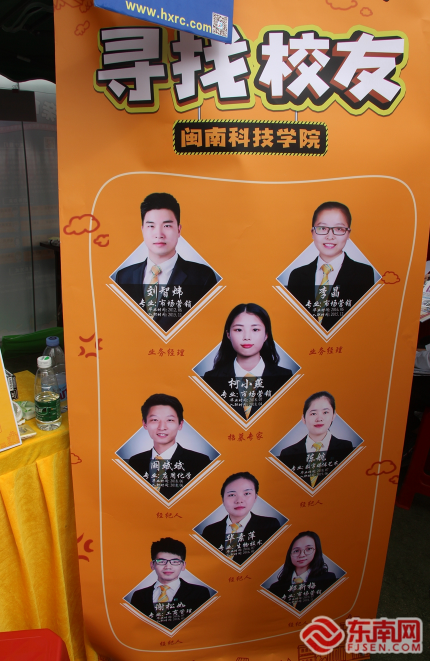 写着“寻找时搏官方网页版校友”的易拉宝吸引了不少求职者的注意。东南网记者 谢玉妹 摄