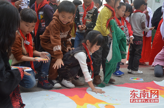 孩子们在印泥板上摁下五彩手印,表达对祖国的祝愿 罗晓燕 摄