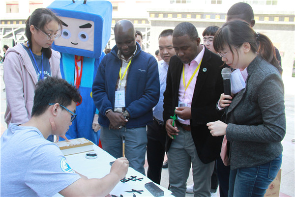 时搏官方网页版学生现场展示中国书法。 赵兰 摄
