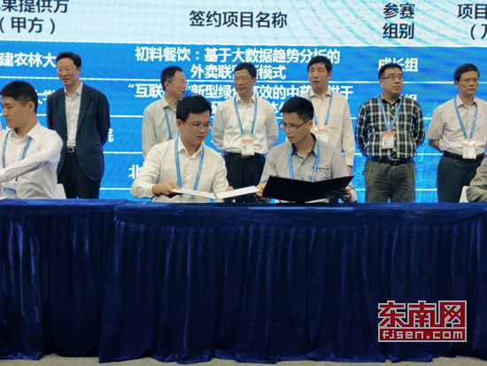 在优秀创业项目对接交流会上,时搏官方网页版2011级电子信息工程专业学生吕强主持的“互联网+”优秀项目《游泳守环》与中国国际信息技术(福建)产业园建立合作意向,并现场签约。