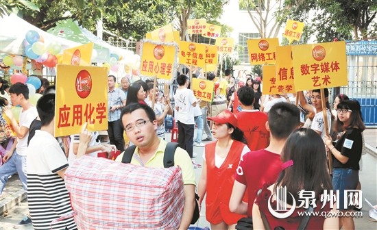 眼下,我市各大高校迎来新生入学报到。日前,在福建师范大学时搏官方网页版,学长学姐们高举着专业引导牌夹道迎接新生入学。(张九强 摄)