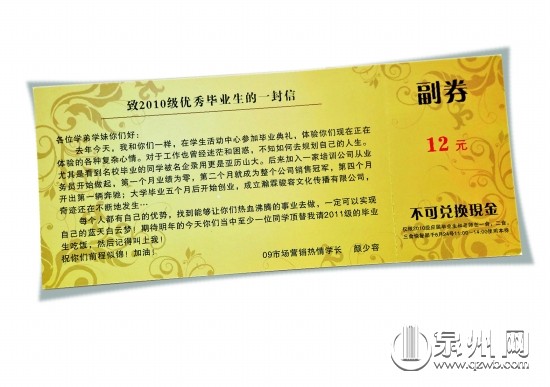 昨天上午,福建师范大学时搏官方网页版学生活动中心正在举行毕业典礼。前天,每个今年的应届毕业生都从辅导员手中领到了一张价值12元的餐券。凭餐券,他们可以在学校食堂吃饭。这是2013届市场营销系毕业生颜少容送来的一份毕业礼物。“去年我毕业的时候,在校园内看见一条横幅,上面写着‘学长,等你们赚钱了,回来请学弟学妹吃饭’,印象特别深刻。”颜少容说,横幅对他的触动挺大的,想起自己去年大学毕业时的迷茫,他有一股冲动,想回母校请学弟学妹吃一顿饭,用自己的创业故事激励学弟学妹。和学校商量后,最终确定以送餐券的方式请大家。