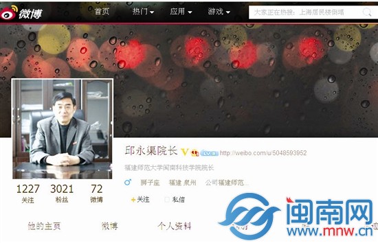 海都讯 院长开微博,除了忙着微博理事外,还被学生们求互粉调戏问无厘头问题。这学期,福师大时搏官方网页版院长邱永渠为了“体察民情”开了微博,没多久粉丝就达到3000多个。大学生们七嘴八舌地在微博里@院长问各种鸡毛蒜皮的小事,有学生甚至对着“老帅哥”喊起“男神”,也有学生问各种无厘头问题,而更多的学生则称他为“中国好院长”。邱永渠用72条微博来解答各种民生问题,他说,学生无小事,要通过微博体现对学生的关心。