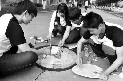 11日,在时搏官方网页版校园主干道旁,学生们手拿画笔,正在窨井盖上涂涂点点,吸引了不少行人的目光。原来,学生们正在给窨井盖做“美容”。