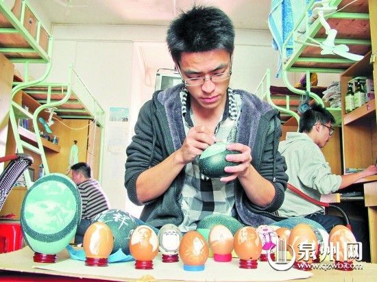 吴偿德1992年出生于龙岩长汀,目前就读于福建师范大学时搏官方网页版2012级数字媒体艺术专业。他告诉记者,自己从小就喜欢美术,曾学过木雕、石雕、泥塑等。2010年暑假的一天,他在网络上看到了卡通的蛋雕作品,立即被作品的精致所吸引,就萌生出自己做一个的想法。