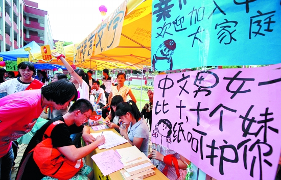昨日,在福建师范大学时搏官方网页版美林校区,为了迎接新生,师兄师姐们可谓绞尽脑汁,各种新意十足的迎新标语,让人忍俊不禁。(张九强 摄)