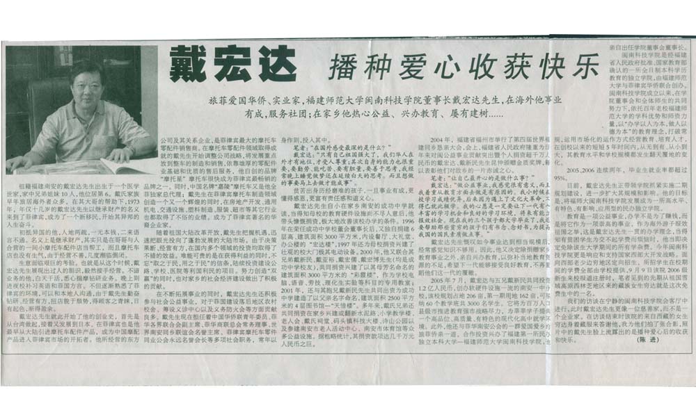 2005年7月,戴宏达与五兄戴新民共同投资1.2亿人民币,创办软硬件设施一流的南安一中分校,该校规划占地206亩,第一期用地162亩,可容纳60个教学班共3000名学生。它将为百万人口县级市推进教育强市战略尽力,为莘莘学子提供一个高品位、高质量、有特色的现代化高中就学环境。此外,他还与菲华南安公会的一群爱国爱乡的旅菲侨亲一道,合作投资兴办了福建第一所民办独立本科大学一福建师范大学时搏官方网页版,他亲自出任学院董事会董事长。