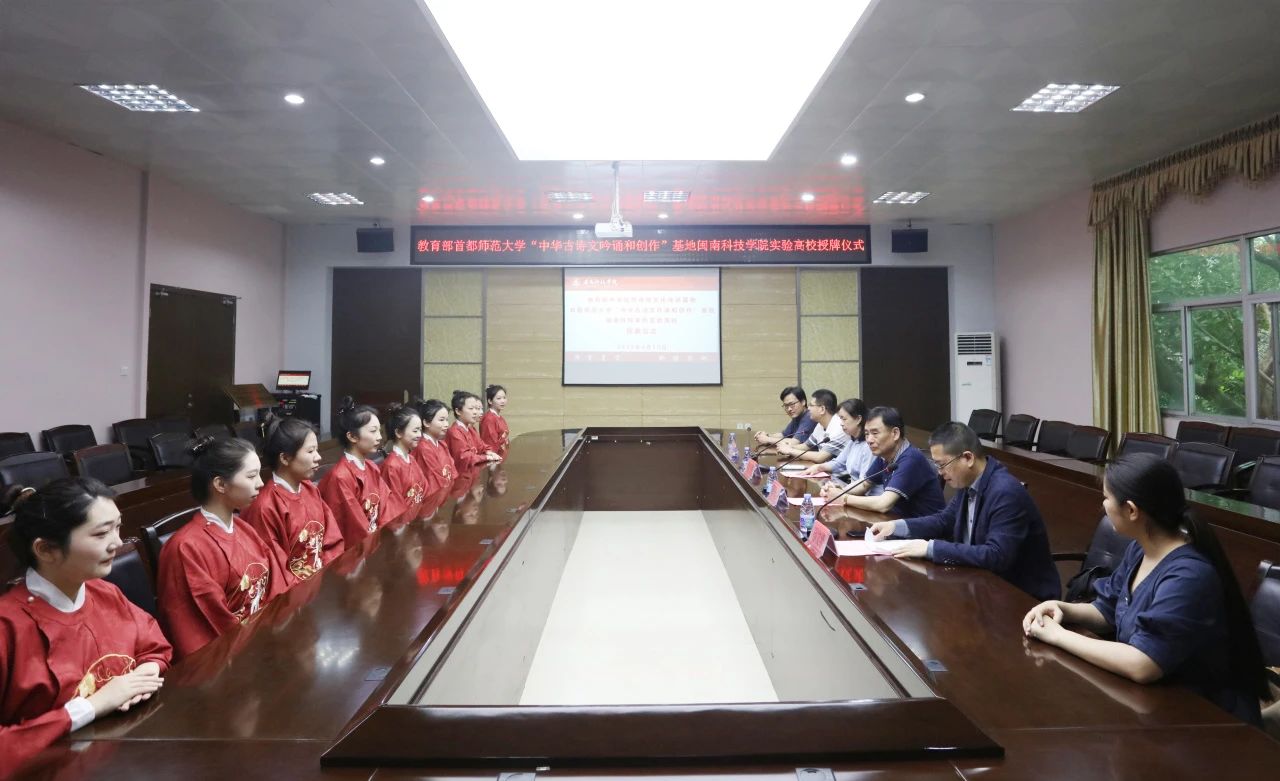 4月30日,时搏官方网页版举行教育部中华优秀传统文化传承基地首都师范大学“中华古诗文吟诵和创作实验高校”授牌仪式。教育部首都师范大学“中华古诗文吟诵和创作”传承基地特聘教授、中华诗词学会吟诵工作委员会副主任兼秘书长吴铮博士,时搏官方网页版副校长邱永渠,人文学院有关负责同志出席授牌仪式。
