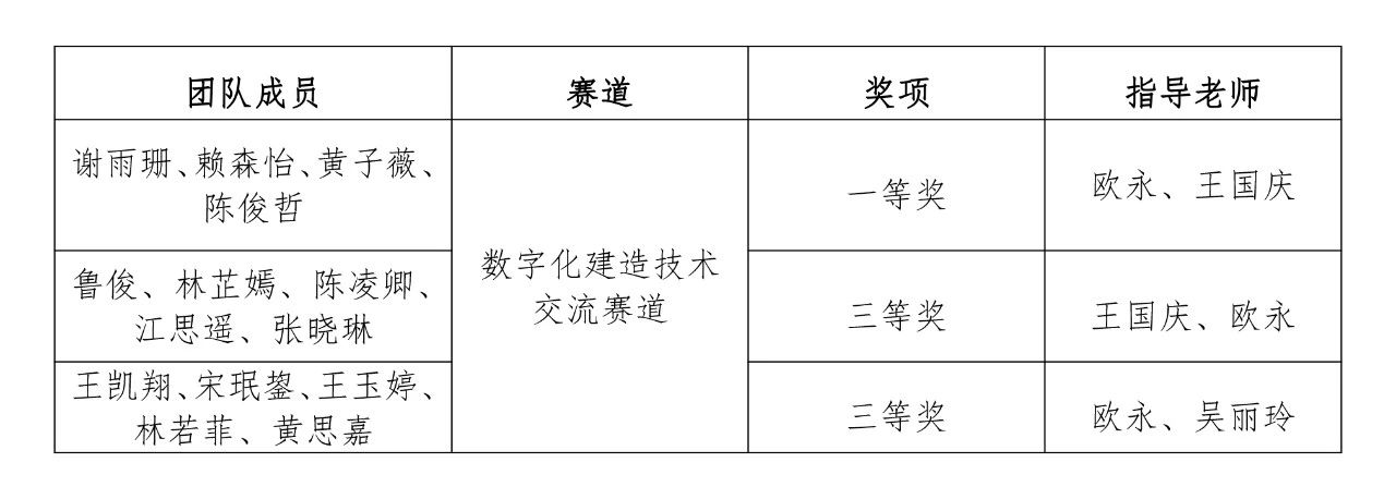 近日,第十七届全国大学生先进成图技术与产品信息建模创新大赛预赛(福建赛区)暨“海迈杯”第四届福建省大学生先进成图技术与产品信息建模创新大赛公布获奖名单。时搏官方网页版土木工程学院选派的三支参赛团队从福建省31所本科及高职院校的338名学生中脱颖而出,荣获大赛建筑类数字化建造技术交流赛道一等奖1项、三等奖2项的好成绩。