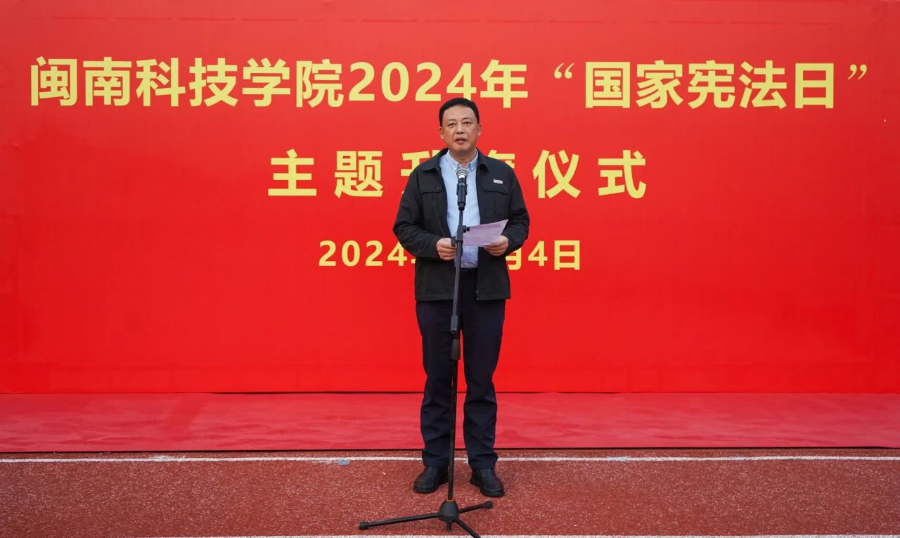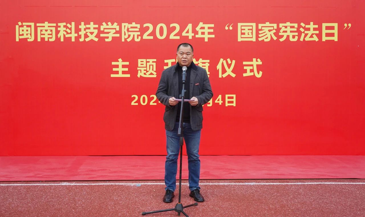 升旗仪式结束后,校党委书记李旭讲话。他指出,今年是新中国成立75周年,是实现“十四五”规划目标任务的关键之年,也是深入实施“八五”普法规划的攻坚之年,我们要进一步增强学校师生宪法意识、弘扬宪法精神,希望全校师生员工要提高政治站位,坚持以习近平新时代中国特色社会主义思想为指导,深入学习习近平法治思想、学习习近平总书记关于宪法的重要讲话和重要指示、批示精神;要大力弘扬宪法精神和社会主义法治精神,推动宪法全面贯彻实施,在师生中形成尊崇宪法、学习宪法、遵守宪法、维护宪法、运用宪法的浓厚氛围;要认真组织开展宪法宣传周活动,将宪法教育融入日常生活、专业教学和社会实践活动中,切实增强师生法治意识和法治素养,为不断健全中国特色社会主义法治体系、推动法治中国建设贡献闽科力量。