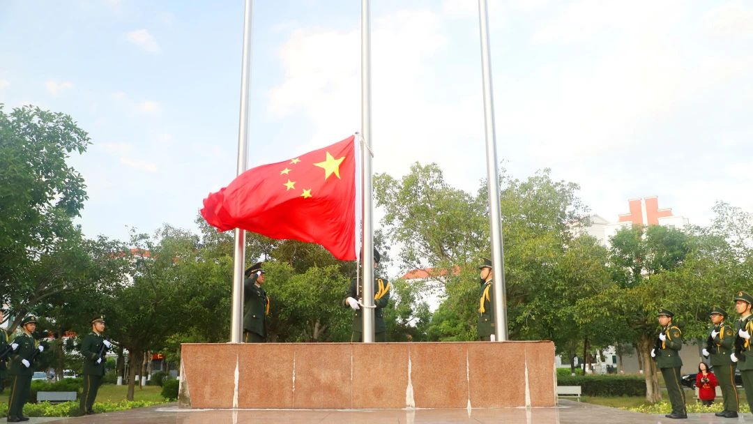 伴随着激昂的国歌,鲜艳的五星红旗冉冉升起,全体师生面向国旗行注目礼。