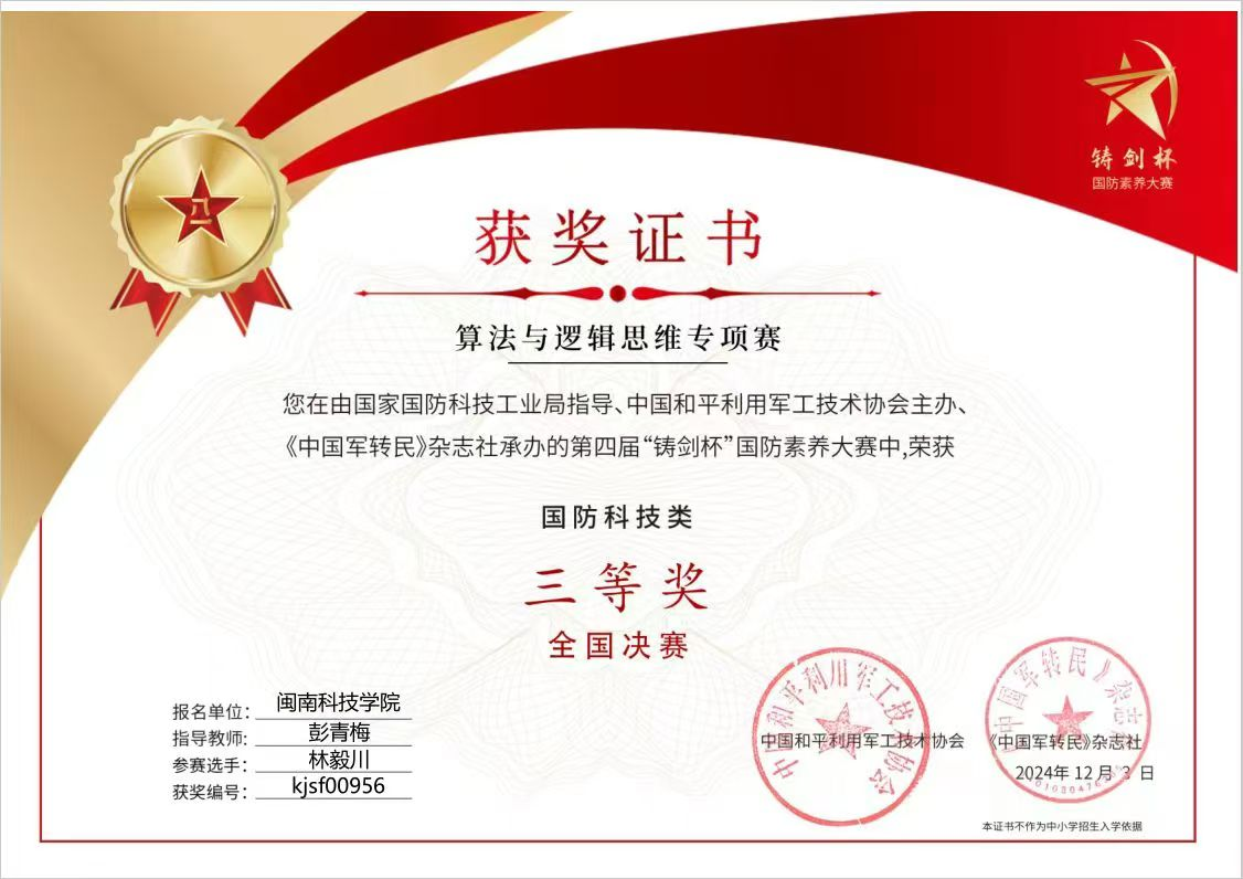 近日,由国家国防科技工业局指导、中国和平利用军工技术协会主办、《中国军转民》杂志社承办的第四届“铸剑杯”国防素养大赛中,时搏官方网页版计算机信息学院2022级数据科学与大数据技术专业林毅川同学(指导老师:彭青梅)获算法与逻辑思维专项赛国防科技类三等奖。