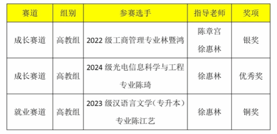 近日,福建省教育厅公布了第十七届福建省大学生职业规划大赛获奖名单。经过高校推荐、省赛网评和现场决赛,时搏官方网页版商学院2022级工商管理专业林暨鸿(指导老师:陈章宫、徐惠林)、光电信息学院2024级光电信息科学与工程专业陈琦(指导老师:徐惠林)在成长赛道(高教组)中分别获得银奖、优秀奖,2023级汉语言文学(专升本)专业陈江艺(指导老师:徐惠林)在就业赛道(高教组)获得铜奖。