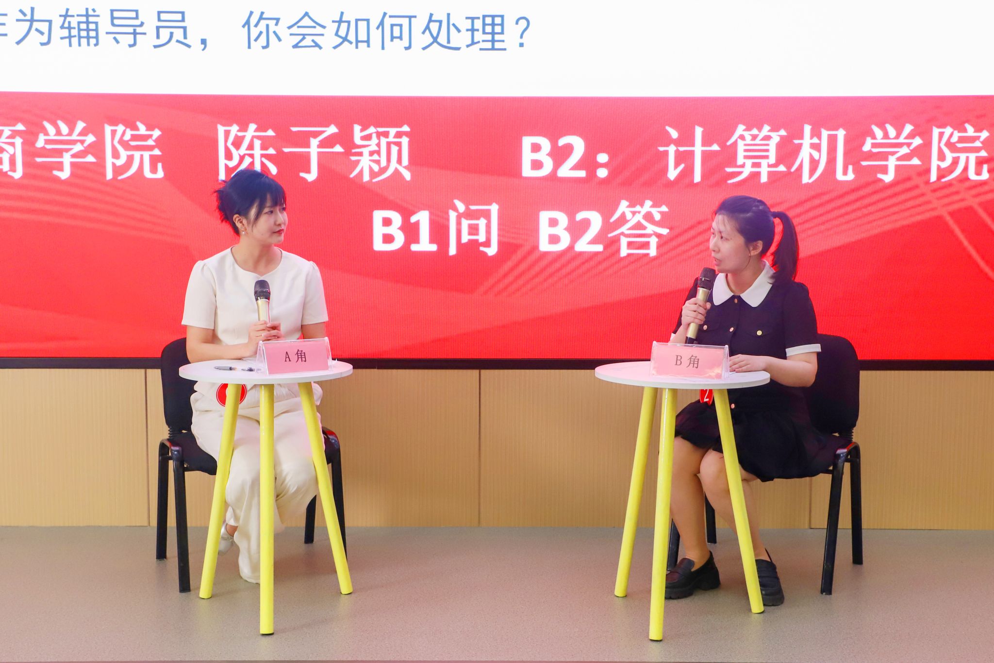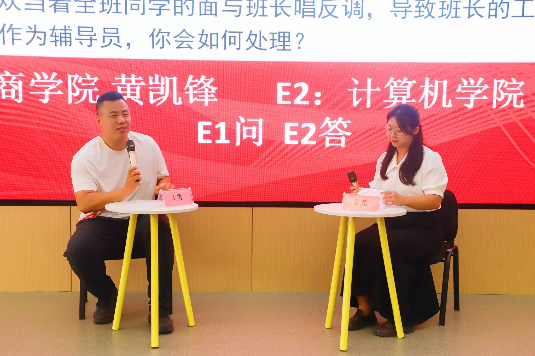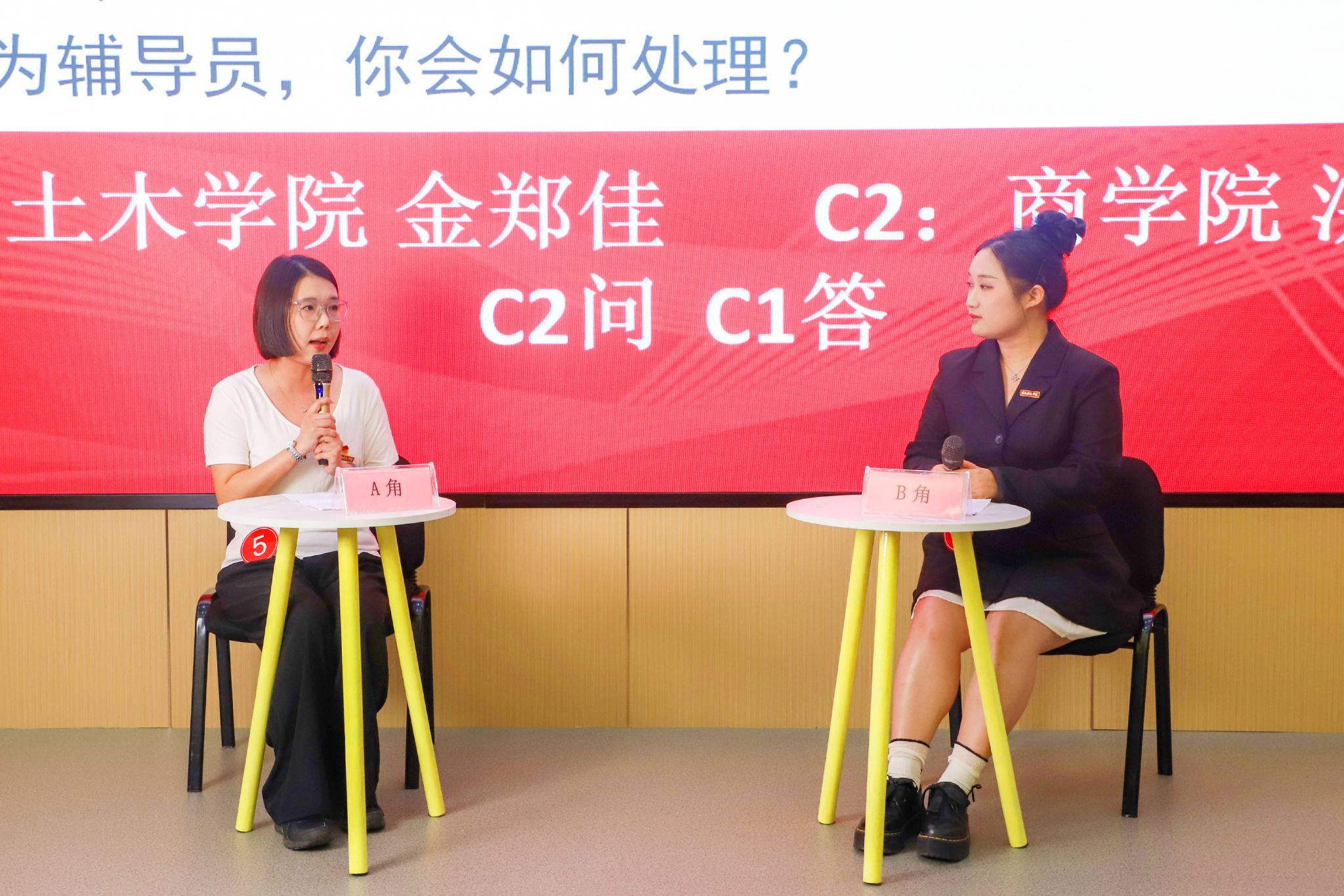 在“谈心谈话”环节,参赛辅导员围绕学生违纪、情感纠纷、就业规划、线上直播、家校关系、少数民族学生管理、学生价值观引导等热点难点问题,通过多样化的情景模拟,面对面的谈心谈话,真实还原育人场景。选手们与助演学生展开深入细致的谈心谈话和循循善诱的教育引导,直观考核辅导员解决学生实际问题和思想问题的能力与水平。
