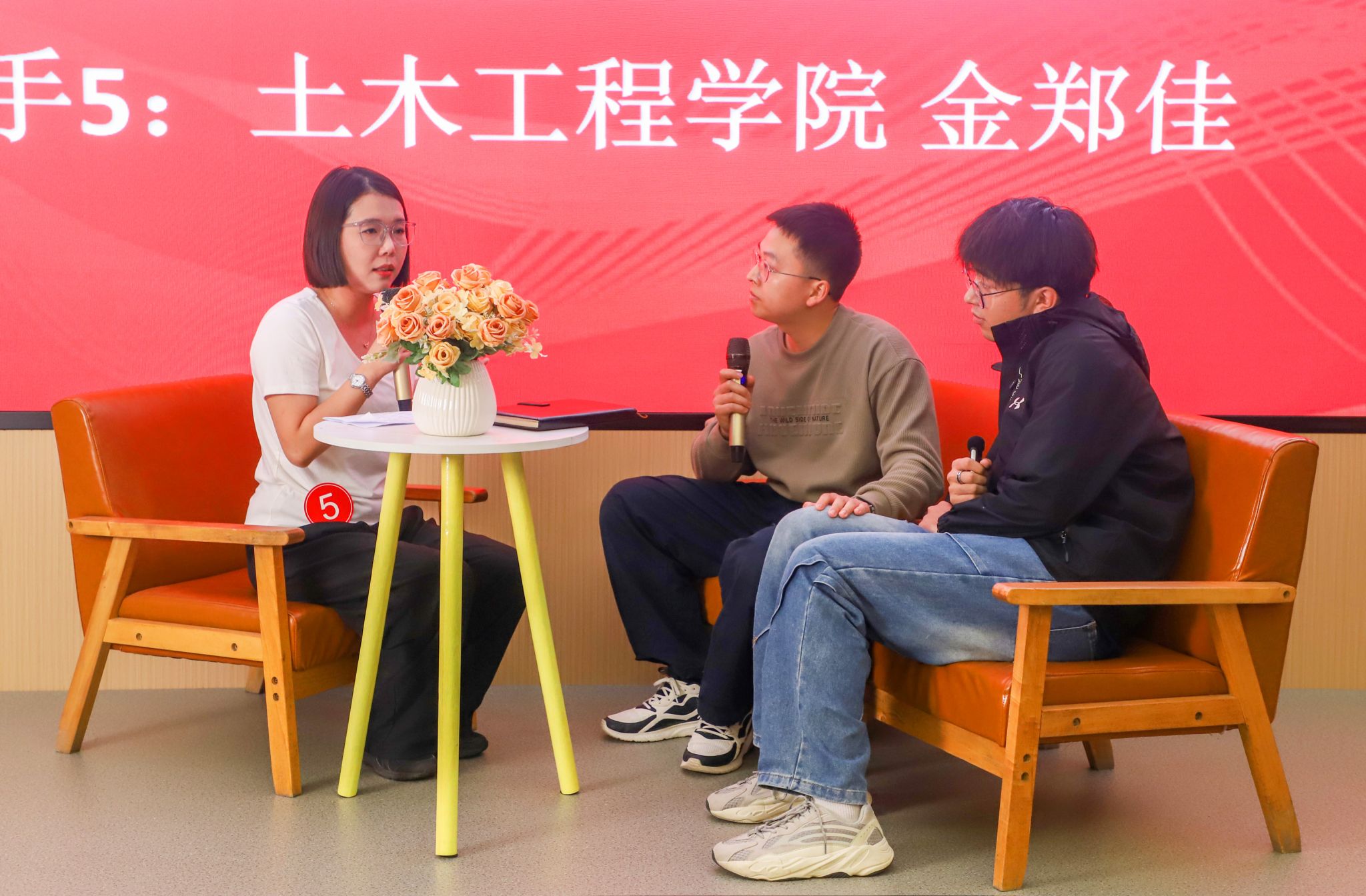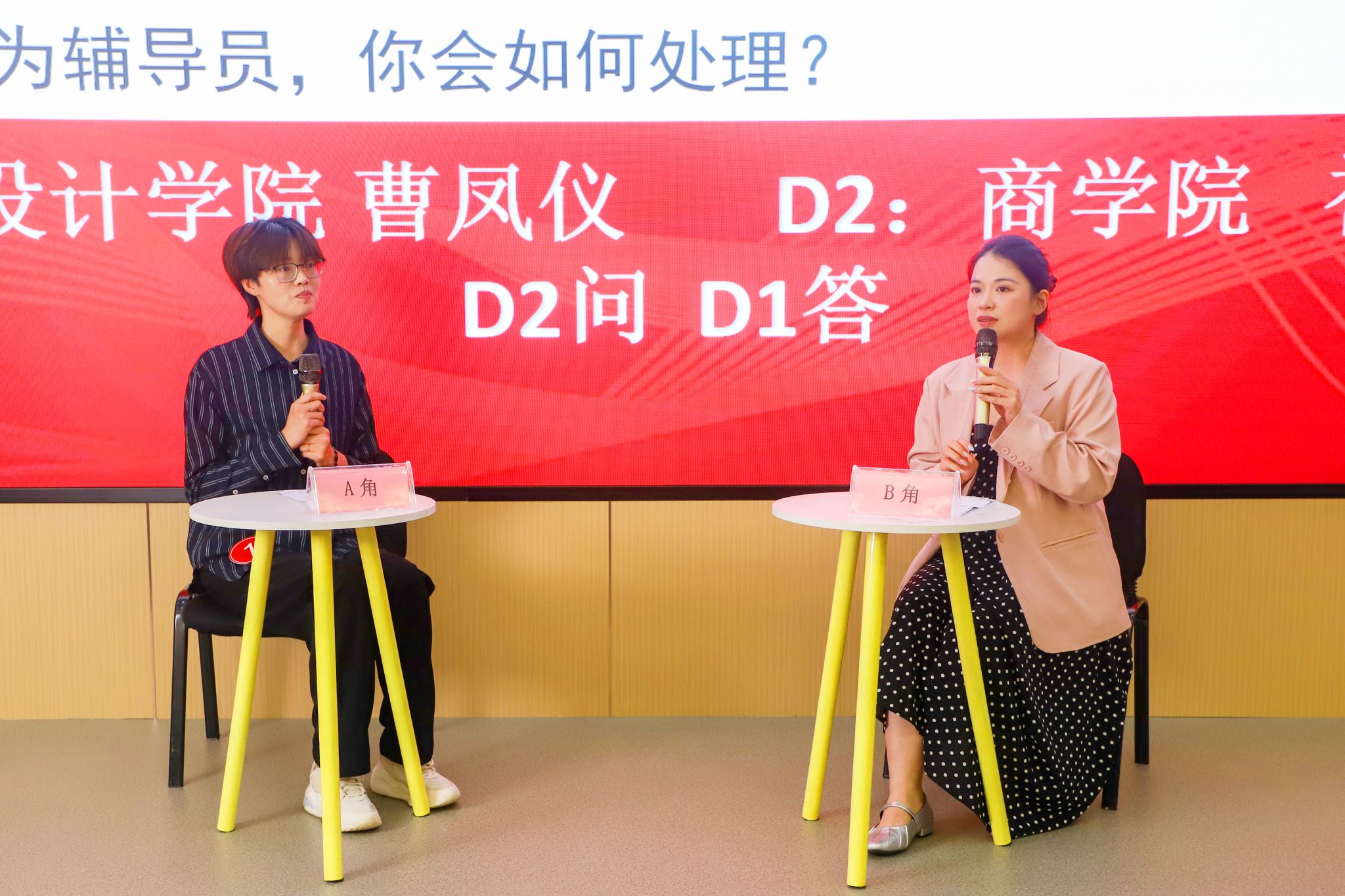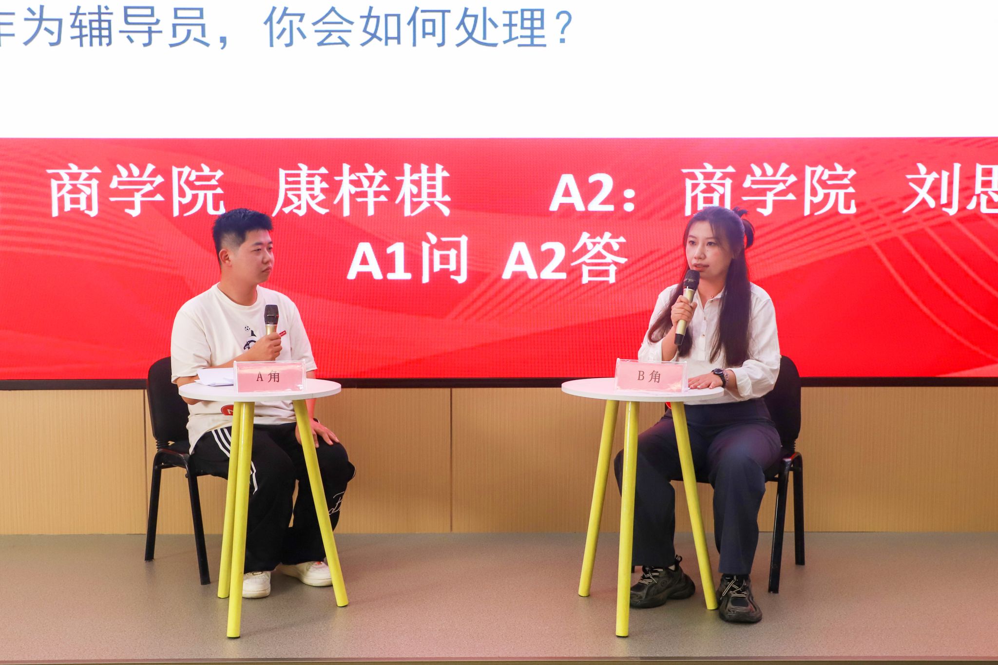 在“谈心谈话”环节,参赛辅导员围绕学生违纪、情感纠纷、就业规划、线上直播、家校关系、少数民族学生管理、学生价值观引导等热点难点问题,通过多样化的情景模拟,面对面的谈心谈话,真实还原育人场景。选手们与助演学生展开深入细致的谈心谈话和循循善诱的教育引导,直观考核辅导员解决学生实际问题和思想问题的能力与水平。