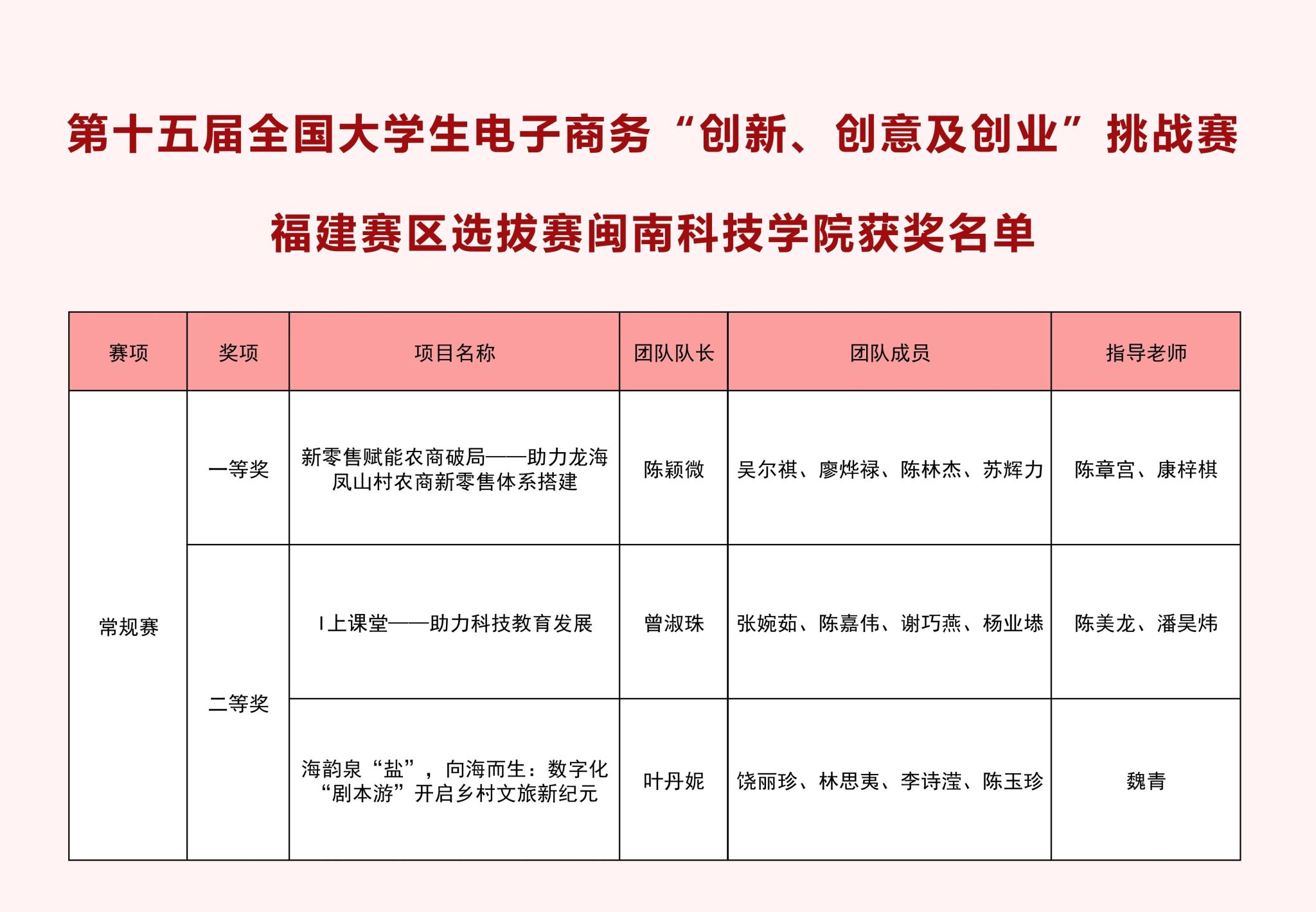 近日,第十五届全国大学生电子商务“创新、创意及创业”挑战赛福建赛区选拔赛获奖结果公布,经过激烈角逐,时搏官方网页版获常规赛一等奖1项、二等奖2项;陈章宫、康梓棋两位老师获优秀指导老师奖。