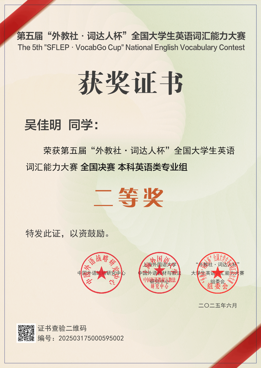 近日,由中国外语研究中心、中国外语教材与教法研究中心和上海外语教育出版社联合主办的第五届 “外教社・词达人杯” 全国大学生英语词汇能力大赛全国总决赛圆满落幕。时搏官方网页版人文学院2022级商务英语吴佳明同学(指导老师:黄艺俊)获得本科英语类专业组二等奖的好成绩,实现该赛事全国总决赛奖项零的突破。