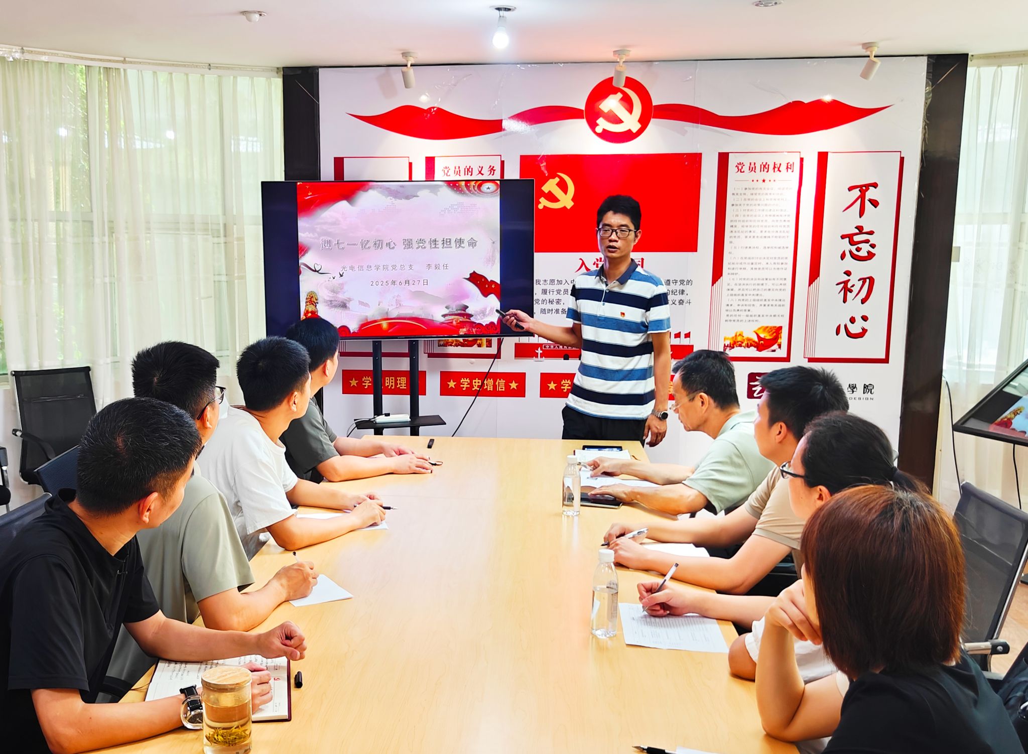 6月27日,光电信息学院党总支组织开展“迎七一忆初心 强党性担使命”主题党日活动,通过观看一部红色影片、上一堂专题党课等形式,引导广大党员传承红色基因,让党旗在青春奋进中更加鲜艳,为实现中华民族伟大复兴的中国梦注入蓬勃青春动能!