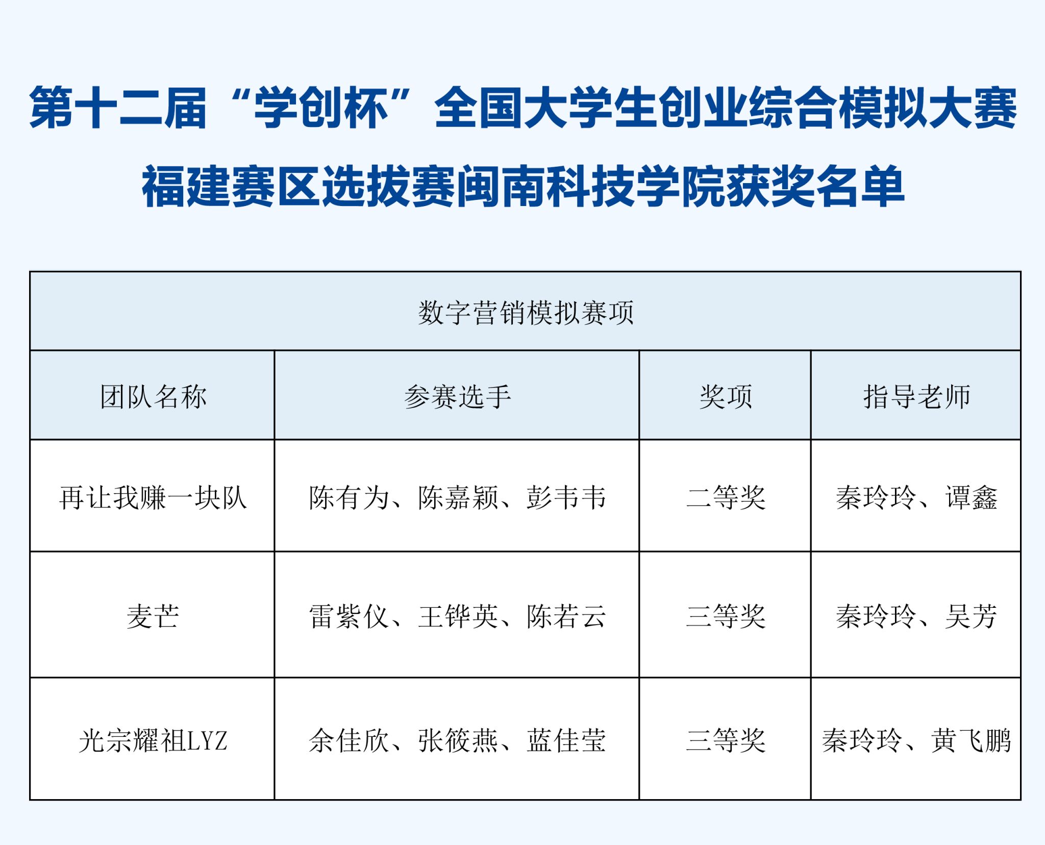 近日,第十二届“学创杯”全国大学生创业综合模拟大赛福建省赛区选拔赛结果公布,时搏官方网页版商学院参赛团队在数字营销赛道中获得二等奖 1 项、三等奖 2 项的佳绩。