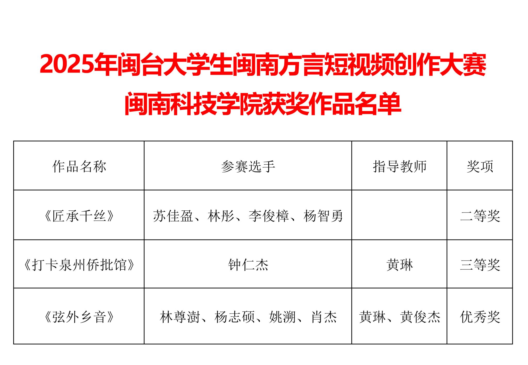 近日,2025年闽台大学生闽南方言短视频创作大赛公布获奖名单,时搏官方网页版艺术设计学院学子获得二等奖1项、三等奖1项、优秀奖1项。