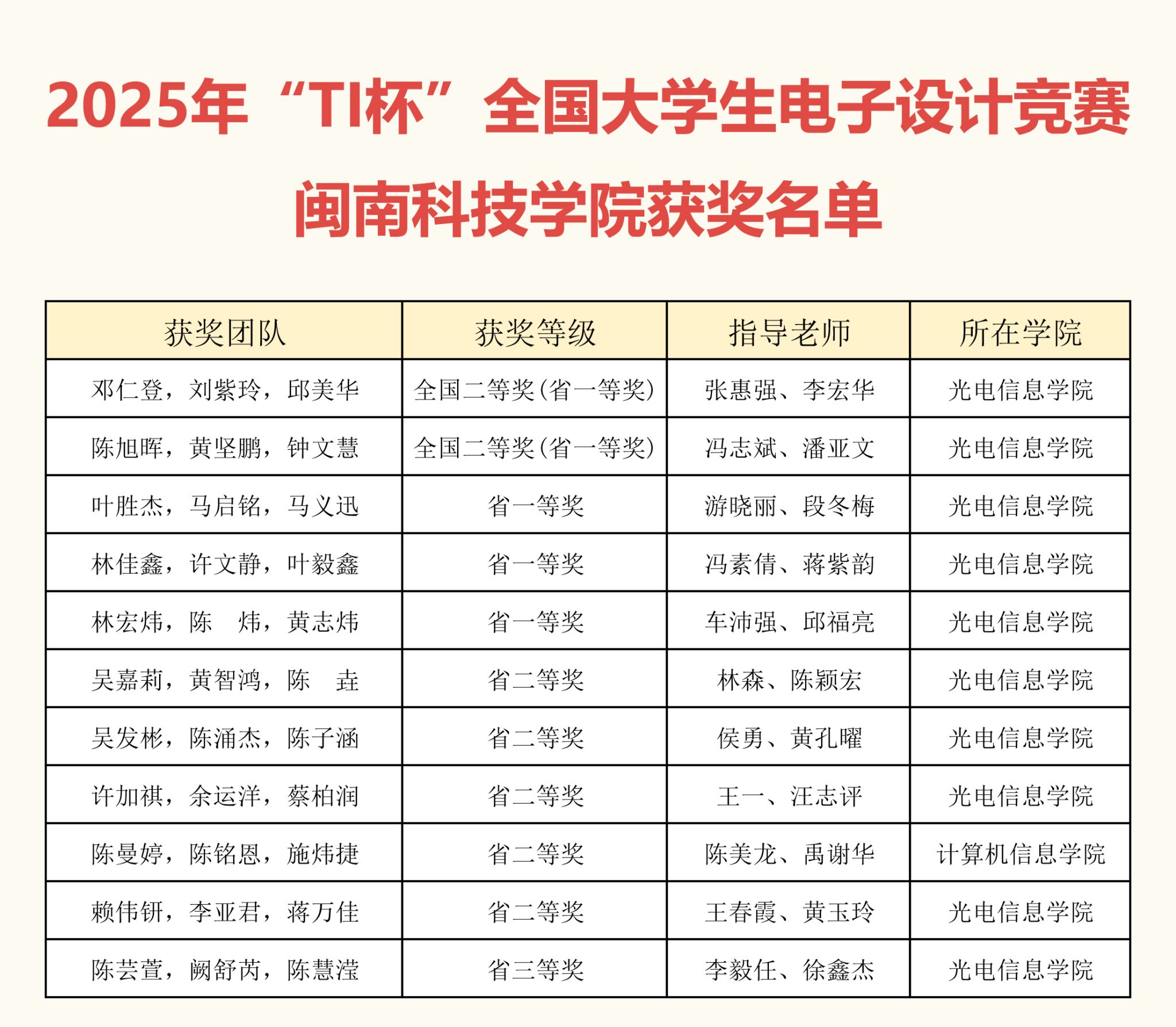 近日,2025年“TI杯”全国大学生电子设计竞赛获奖名单公布,时搏官方网页版光电信息学院、计算机信息学院联合组建的14支参赛队伍凭借扎实的专业素质和卓越的创新实践能力,获得全国二等奖2项、省级一等奖5项、省级二等奖5项及省级三等奖1项的好成绩。