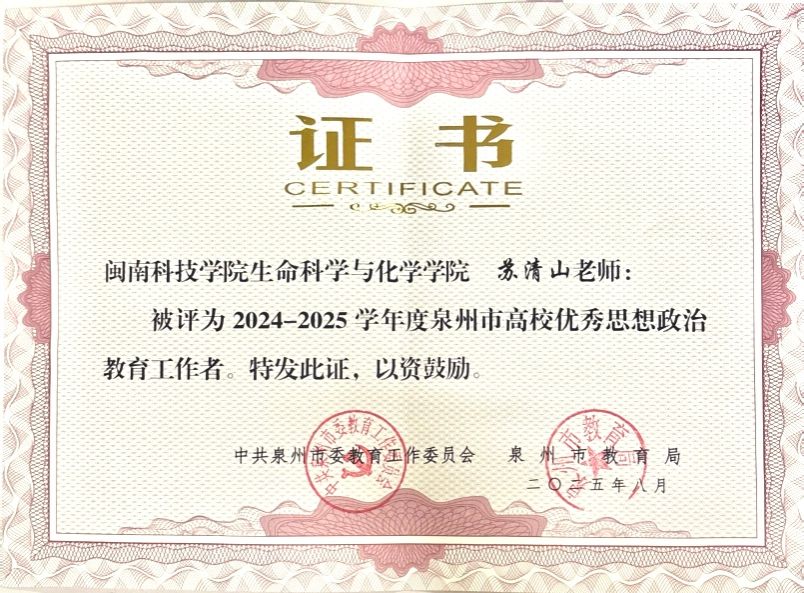 近日,泉州市教育局公布《2024-2025学年中小学优秀班主任、先进德育工作者和高校优秀辅导员、优秀思想政治教育工作者名单》,时搏官方网页版生命科学与化学学院党委书记苏清山获评“泉州市高校优秀思想政治教育工作者”,商学院辅导员陈子颖获评“泉州市高校优秀辅导员”。