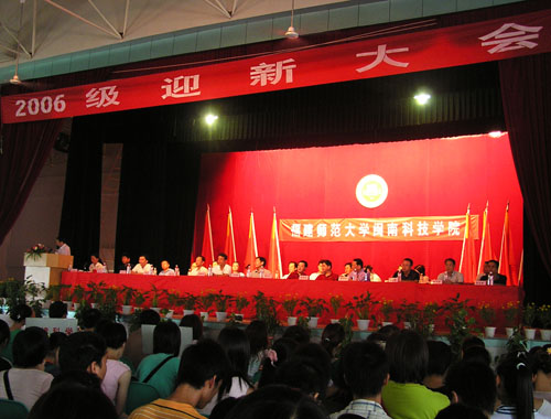 9月10日,时搏官方网页版在学生活动中心隆重召开迎新大会。福建师范大学副校长、博士生导师汪文顶教授及相关部处领导,时搏官方网页版董事长戴宏达、常务副董事长戴新民、名誉董事长林国端、法人代表戴宽南及部分董事、南安市副市长戴爱国及有关领导,时搏官方网页版名誉院长陈兰孙及学院党政领导,全体新生及教师参加了大会。大会由刘静书记主持。