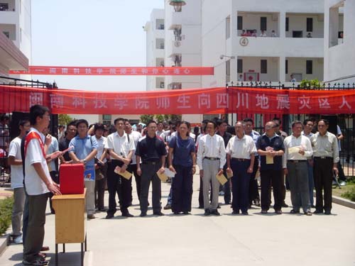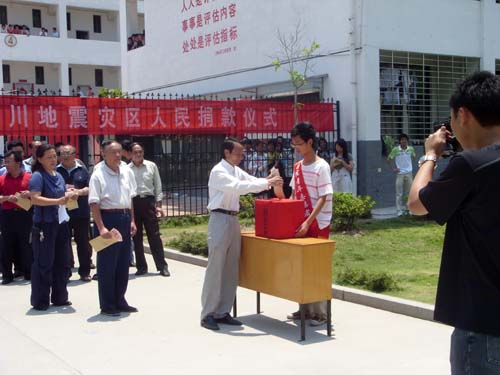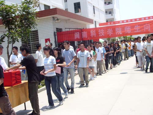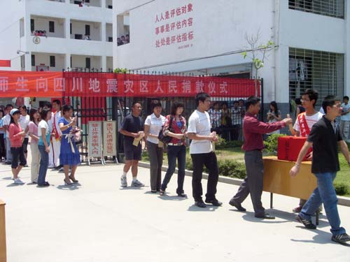 中午12点,老师和同学们刚下完课没顾得上吃饭,就有序的聚集在学生社区门口,参加在那里举行的为四川地震灾区捐款活动。 活动现场,一条醒目的横幅“汶川——时搏官方网页版师生和你心连心”深深吸引和感染着在场的每一个人,此时此刻这也许就是我们大家最想说的话。在院工会和团委分别宣读了捐款倡议书后,捐款活动开始了,我院全体党政领导走在最前面带头捐款,随后,各系、部、学生各团支部、学生个人也都有序的献出爱心。短短的十几分钟里,共捐款79977.6元。院党委常务副书记刘静指出这只是我院的首笔捐款,接下去还将继续组织师生通过捐钱捐物、义务献血等形式献出爱心。
