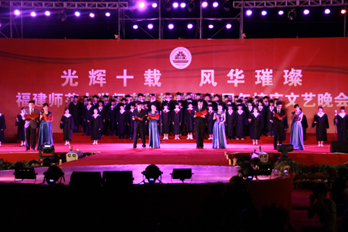 先生再次为大家表演了树叶吹奏《菊花台》,现场沉浸在大自然所带来的音乐声中。振奋人心的音诗画《闽科颂》,向在场观众们述说了闽科的十年间的成长历程,一句“我们是光荣的闽科人”响彻天际,得到了全场的热烈响应。