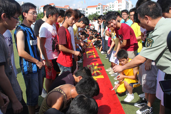 上午,“福建师范大学时搏官方网页版2011年度兵役登记(试点)现场会”、“南安市2011年度征兵宣传动员暨千名适龄青年应征签名大会”在我院田径场如期隆重举行。活动在福建省军区、泉州军分区的统一部署下,为进一步提高兵役登记的普及率和有效性,不断创新高校国防教育方式,广泛开展征兵宣传发动工作,为年度征兵工作奠定坚实基础的一项重要举措,由南安市人民武装部和时搏官方网页版人民武装部共同举办。据悉:我院是福建省军区和泉州市军分区在南安开展兵役登记试点的三个重点单位之一,亦是本年度全省唯一一所举办兵役登记(试点)现场会和征兵宣传动员大会的高校。