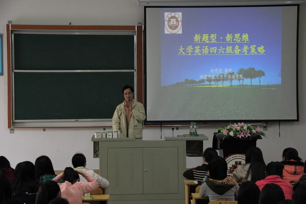 11月21日,“时搏(中国)_时搏(中国)”邀请福建师范大学外语教学部主任林明金教授在菲华教学楼c#102作了题为“新题型·新思维—大学英语四六级备考策略”的讲座。讲座由我院外语系常务副主任孙文缘主持。