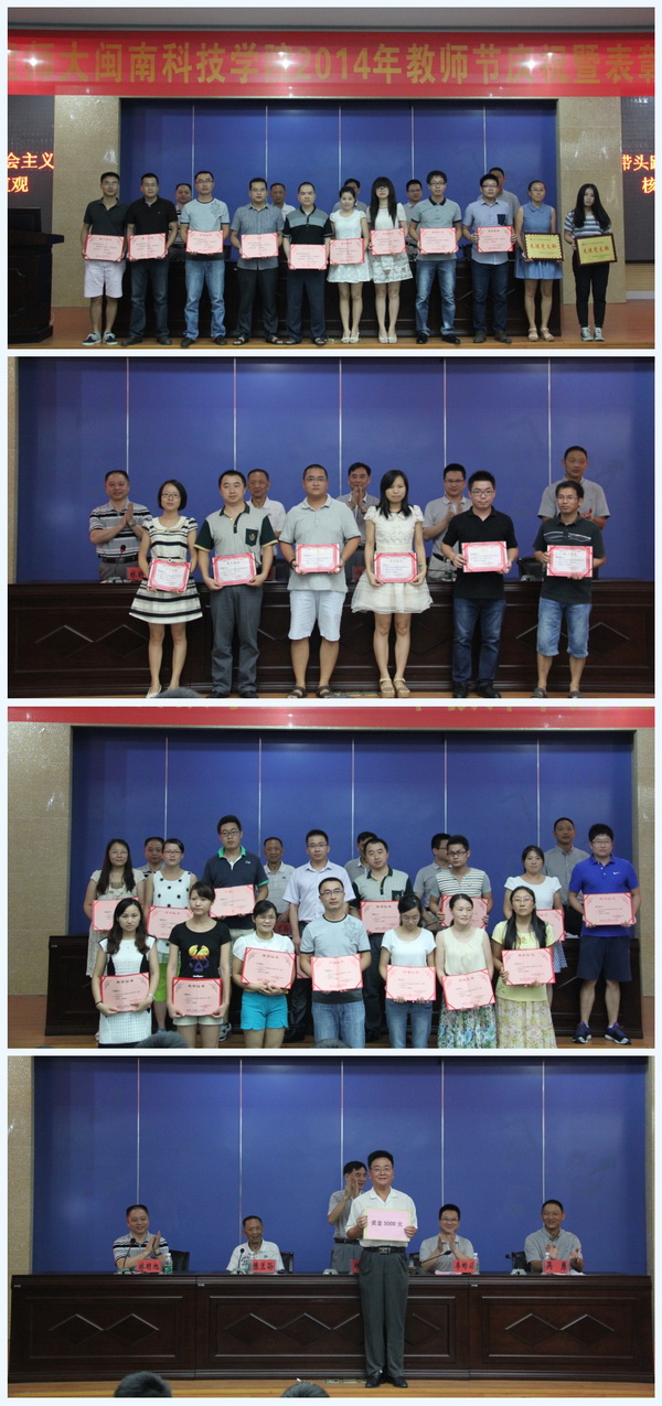 党委副书记李彬源宣读了《福建师范大学时搏官方网页版2013-2014学年获得各级各类荣誉称号的先进集体和先进个人名单》。副院长吴勇宣读了《福建师范大学时搏官方网页版2014年教师节教育教学先进单位和个人表彰决定》。全体与会领导为获奖的先进集体和先进个人颁奖。