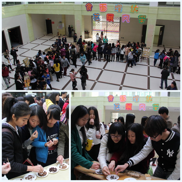 为提供专业实践与创新平台,培养和提高大学生专业实践能力,12月17日,生命科学与化学系2012级食品科学与工程专业在图书馆一楼举办“食面埋伏·艺展风采”食品工艺展,展出巧克力、椰丝球、牛轧糖、果酱、泡菜、蛋糕、泡芙等同学们精心制作的食品,吸引众多师生前来围观品尝。