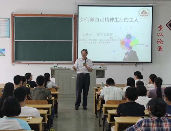 6月3日,“时搏(中国)_时搏(中国)”邀请福建师范大学心理学博士生导师、国家人力资源和社会保障部心理咨询专家、第六届福建省心理学会理事长程利国作题为“如何做自己精神生活的主人”讲座。讲座由院关工委主任、光电信息科学系主任杨文琴教授主持。