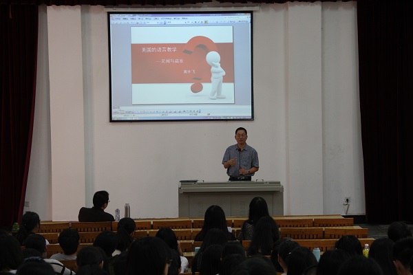 讲座上,黄怀飞教授通过美国的语言教学理论、教学观摩以及教与学启示的介绍,深刻阐述了美国大学的教育体制、教学理念、培养目标,重点强调了创新与个性的重要性。他还通过大量图片介绍了美国大学和大学生学习方法,希望同学们能够能言善辩、爱思考、善交流、学会提出新颖的观点。