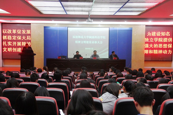 会上,院党委常务副书记林明旭作重要讲话。他指出,过去的两年,院党委在福建师大党委的正确领导下,紧紧围绕学院中心工作、以改革促发展,抓稳定保大局,制定出台了《中共福建师范大学时搏官方网页版委员会关于进一步加强精神文明建设工作的意见》和《福建师范大学时搏官方网页版精神文明建设评选管理办法(试行)》,扎实开展精神文明创建活动,取得了明显成效。一是围绕健全制度,扎实推进思想理论建设,社会主义核心价值观深入人心;二是围绕文化建设,深化创建活动,校园文明程度持续提升;三是围绕服务社会功能,加强文明共建,推动精神文明建设成果的对外辐射。林明旭强调,精神文明建设工作要常抓不懈,要继续围绕学院的工作中心,从形象建设到内涵建设,从制度建设到自觉实践,不断提升精神文明的总体水平和质量,全力推进学院各项工作再上新台阶。一要促进改革,不断完善学院精神文明创建的长效机制;二要加强宣传,着力打造学院精神文明创建的特色和品牌;三要深化成果,构建社会主义核心价值观传播体系,不断开创学院精神文明建设新局面,为建设知名独立学院提供强大的思想保障和精神动力。