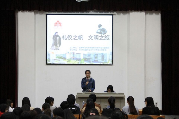13日, 2014级国际经济与贸易专业举办“礼仪之帆,文明之旅”主题道德讲堂活动。活动围绕“听一首歌曲”、“诵一段经典”、“看一段视频”、“做一个示范”、“送一份感想”、“做一个承诺”六个环节展开。在“送一份感想”环节中,同学们纷纷在便利贴上写下自己对中华礼仪文化精髓的认识和感受,专业班主任林清强老师也上台畅谈了自己的感想,他告诫同学们“家中小礼,社会大礼,不管小礼大礼,做人文礼”。经济管理系团总支书记潘雄希望同学们在生活当中做到“己所不欲,勿施于人”和“平等、自由、博爱”,将良好的文明行为习惯应用到学习生活中,规范自身行为和道德礼仪,践行社会主义核心价值观,引领校园文明新风尚。