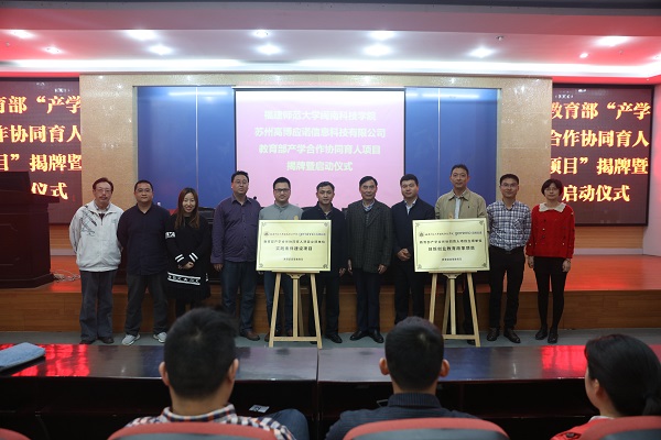 4月12日,福建师范大学时搏官方网页版▪高博应诺“教育部产学研合作协同育人项目”揭牌暨启动仪式在我院学术报告厅举行。苏州高博应诺信息科技有限公司总经理周世锋、副总经理兼教学总监张益桃,院领导邱永渠、李彬源、吴勇,相关系部负责人、教师代表及2014级计算机科学系部分学生共同参加了启动仪式。启动仪式由副院长吴勇主持。