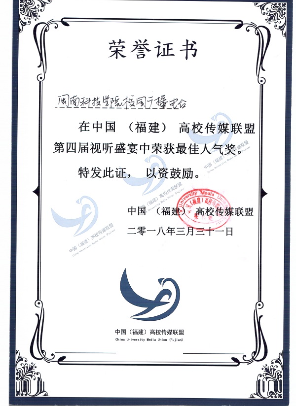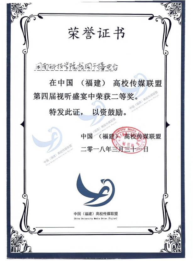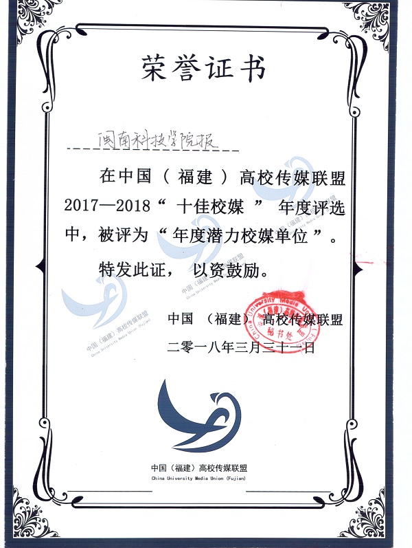 3月31日,2018中国(福建)高校传媒联盟第十届年度峰会召开,在颁奖仪式上,我院校园广播电台选送作品《疯狂动物城》影视片段配音(配音:陈启荣,黄嘉静,林家晟,姚晨心,剪辑:石冬明)获第四届“视听盛宴”二等奖和最佳人气奖,《时搏官方网页版报》报社获评2017-2018“十佳校媒”年度评选“年度潜力校媒单位”。