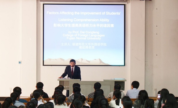 “影响大学生提高英语听力水平的诸因素”主题讲座。讲座由外语系副主任陈孔吉老师主持。