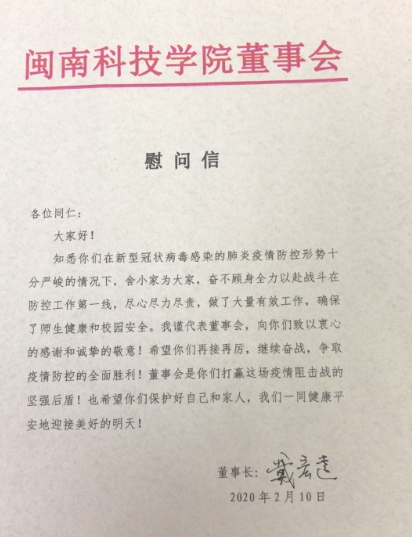 戴宏达董事长还十分牵挂学校疫情防控工作,通过电话、微信等渠道了解疫情防控工作进展情况。2月10日,戴宏达董事长发来慰问信,代表董事会表达了对学校疫情防控工作的关心支持,对学校采取的防控措施高度评价,对奋战在防控一线的师生致以感谢和敬意。勉励大家团结一心、众志成城、共同筑牢防控疫情的铜墙铁壁,为全国抗击疫情大局作出闽科贡献!