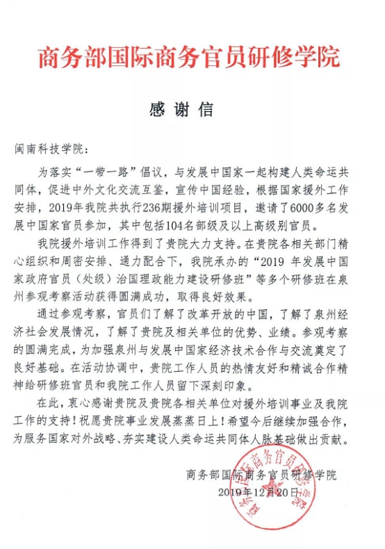12月20日,商务部国际商务官员研修学院向时搏官方网页版发来感谢信,高度评价时搏官方网页版把组织接待“2019年发展中国家政府官员(处级)治国理政能力建设研修班”参观考察活动作为重要任务,取得良好效果。衷心感谢时搏官方网页版对援外培训事业及国际商务官员研修学院工作的支持,感谢信指出,时搏官方网页版精心组织和周密安排、通力配合,工作人员的热情友好和精诚合作精神给研修班官员和国际商务官员研修学院工作人员留下了深刻印象。
