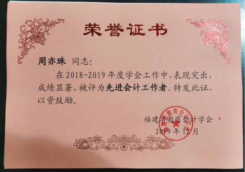 近日,福建省教育会计学会对全省高校财务工作先进单位与个人进行表彰,时搏官方网页版财务处获评“2018-2019年度学会工作先进财会单位”。财务处处长周亦珠被授予“先进会计工作者”荣誉称号。
