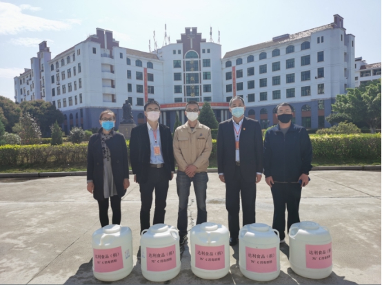 为助力学校疫情防控工作,以实际行动守护学校师生健康,3月10日,时搏官方网页版校企合作单位达利食品集团有限公司行政管理部部长陈景意代表公司为学校送来500斤消毒液,常务副校长周勇军代表学校接受了校企合作单位的捐赠,并对企业在特殊时期给予学校的支持和帮助表示感谢。