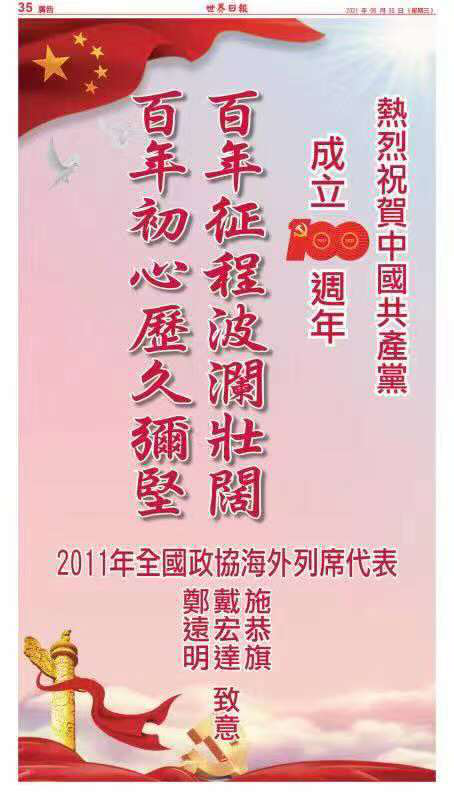 6月30日,时搏官方网页版董事长戴宏达联合上好佳董事长施恭旗和菲律宾南安同乡总会理事长郑远明,通过菲律宾《世界日报》刊发“百年征程波澜壮阔 百年初心历久弥坚”贺词,热烈庆祝中国共产党成立100周年。