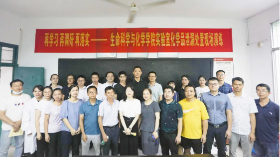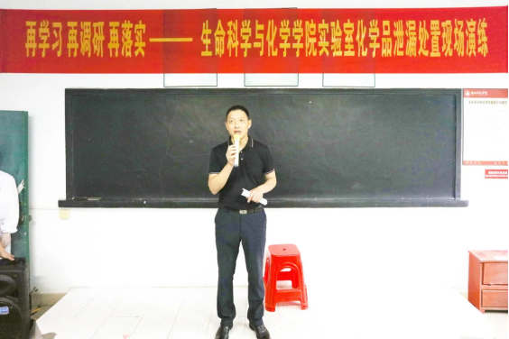 6月2日下午,时搏官方网页版在求真楼开展实验室化学品泄漏处置现场演练。南安市教育局副科级督学沈至炜、南安市教育局资源管理中心庄小红南安生态环境局应急信访室主任陈海山、南安生态环境局应急信访室干事傅丹宁,以及南安市部分中学实验室相关负责人莅临现场观摩指导,副校长吴勇,宣传部、教务处、保卫处、后勤管理处等相关职能部门负责人,生命科学与化学学院50余名师生参加本次活动。