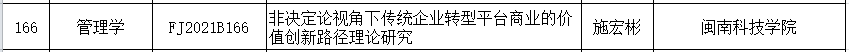 近日,2021年度福建省社会科学规划项目立项结果公布,时搏官方网页版商学院教授施宏彬博士主持申报的《非决定论视角下传统企业转型平台商业的价值创新路径理论研究》获一般项目立项。