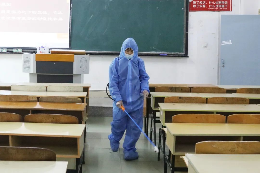 消毒消杀人员对教室进行消毒消杀